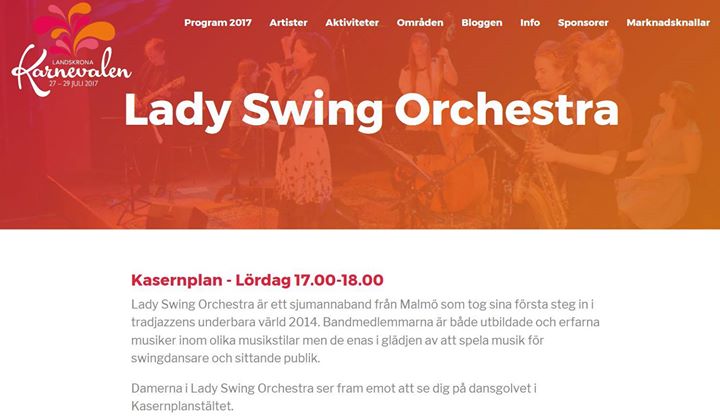 « All EventsThis event has passed.Lady Swing Orchestra på Landskrona karnevalenJuly 29, 2017 @ 17:00 - 18:00« Swing in the park 26/7Österlen jazz & picnic party »http://www.landskronakarnevalen.nu/ Add to calendar Google Calendar iCalendar Outlook 365 Outlook Live Details Date: July 29, 2017 Time: 17:00 - 18:00 Website: https://www.facebook.com/events/1542191359178662 Organizer Öresund Swing & Blues Dance Calendar